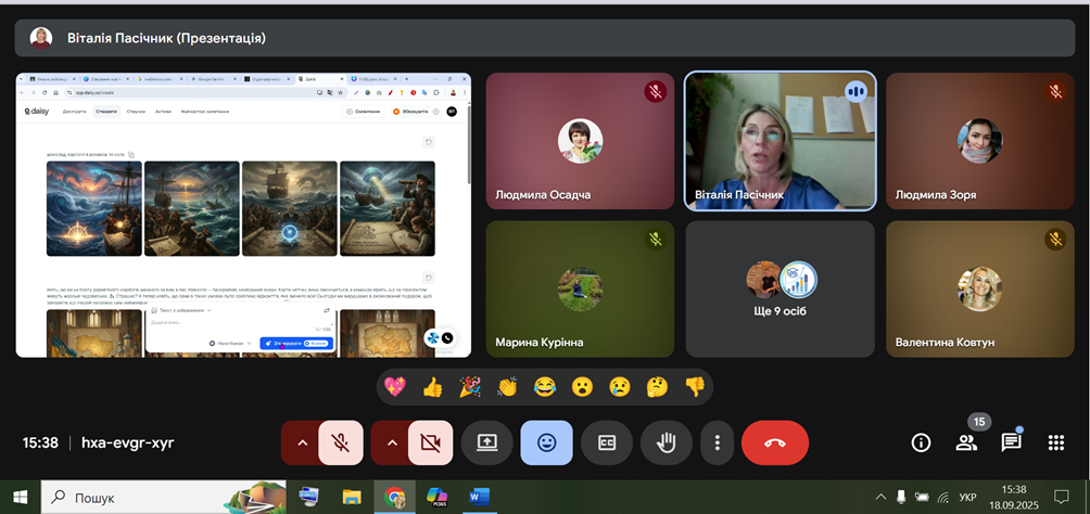 Під час практичної частини вчителі працювали з прикладами генерування зображень для коротких відеофрагментів, що можуть стати цікавим початком уроку, візуалізованим поясненням складних понять чи ефектною рефлексією наприкінці заняття. Учасники мали можливість випробувати прості цифрові інструменти, які не потребують складних технічних навичок, але водночас забезпечують високий рівень візуальної привабливості матеріалу.