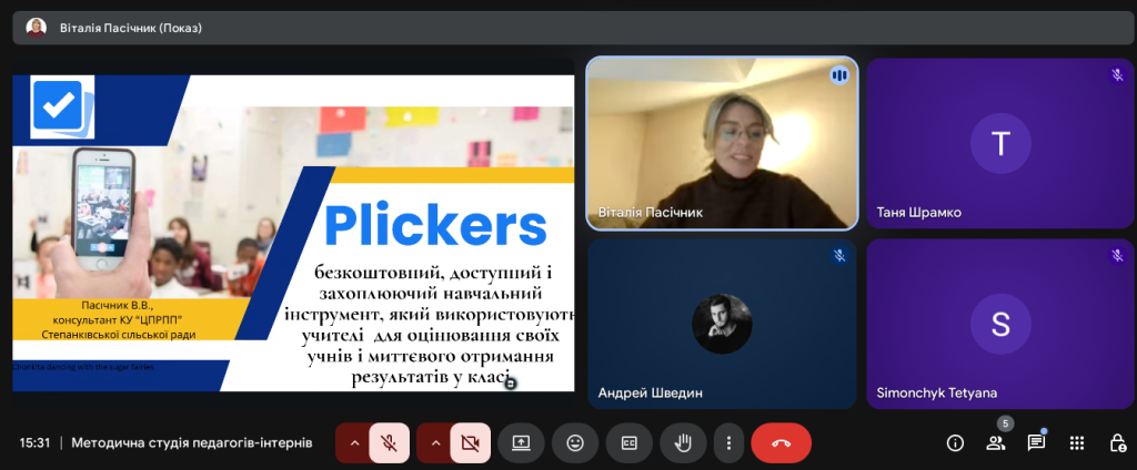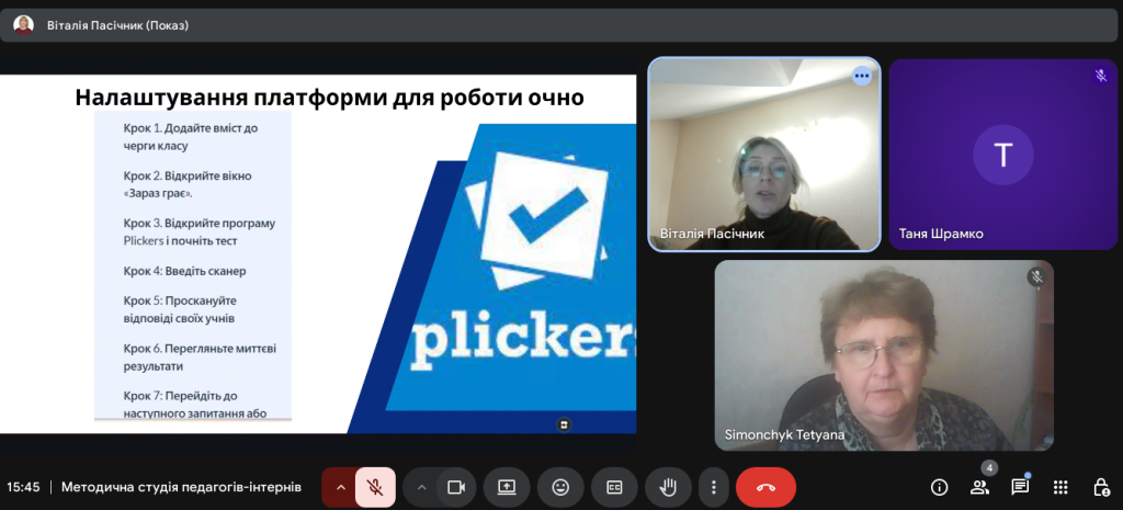 Віталія Пасічник, консультант Центру, представила сервіс Plickers та продемонструвала його роботу. Цей цифровий ресурс дозволяє проводити мобільні голосування і фронтальні опитування під час навчального заняття з вивченого або поточного матеріалу в тестовій формі, що забирає не більше кількох хвилин. Отримання результатів опитування відбувається на занятті без тривалої перевірки та миттєво виводиться на екран комп’ютера (телевізора, проектора), без під’єднаного до Інтернету. Наявність смартфонів або комп’ютерів не потрібна: тільки смартфон учителя навіть без доступу до Інтернету.