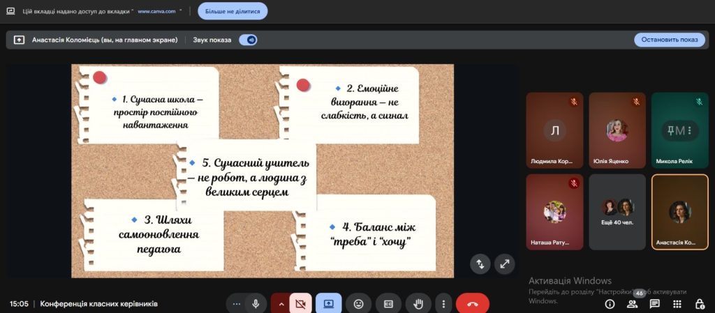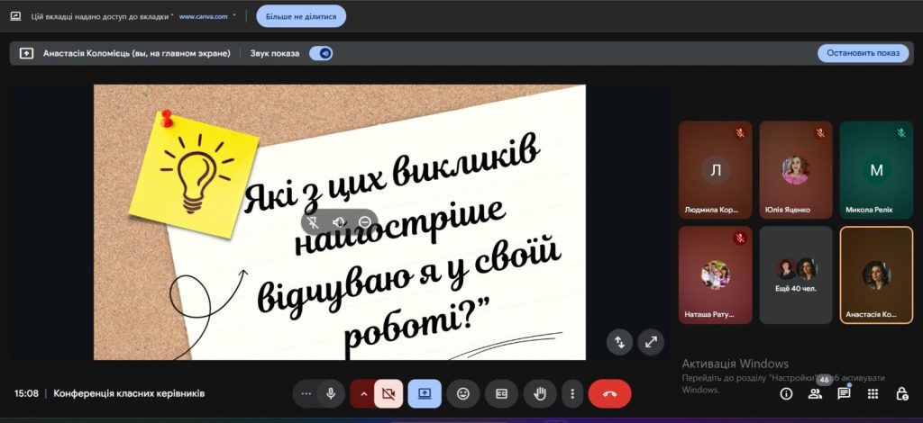 Анастасія Коломієць , консультанка Центру ,розповіла про сучасні виклики для класного керівника, ознайомила про нові орієнтири вчителя НУШ, надала цікаві теми та ідеї проведення класних годин та практично ознайомила із цифровими інструментами для організації дозвілля класу. Разом із учасниками провели класну годину по-новому, де застосовували знання отримані під час вебінару!