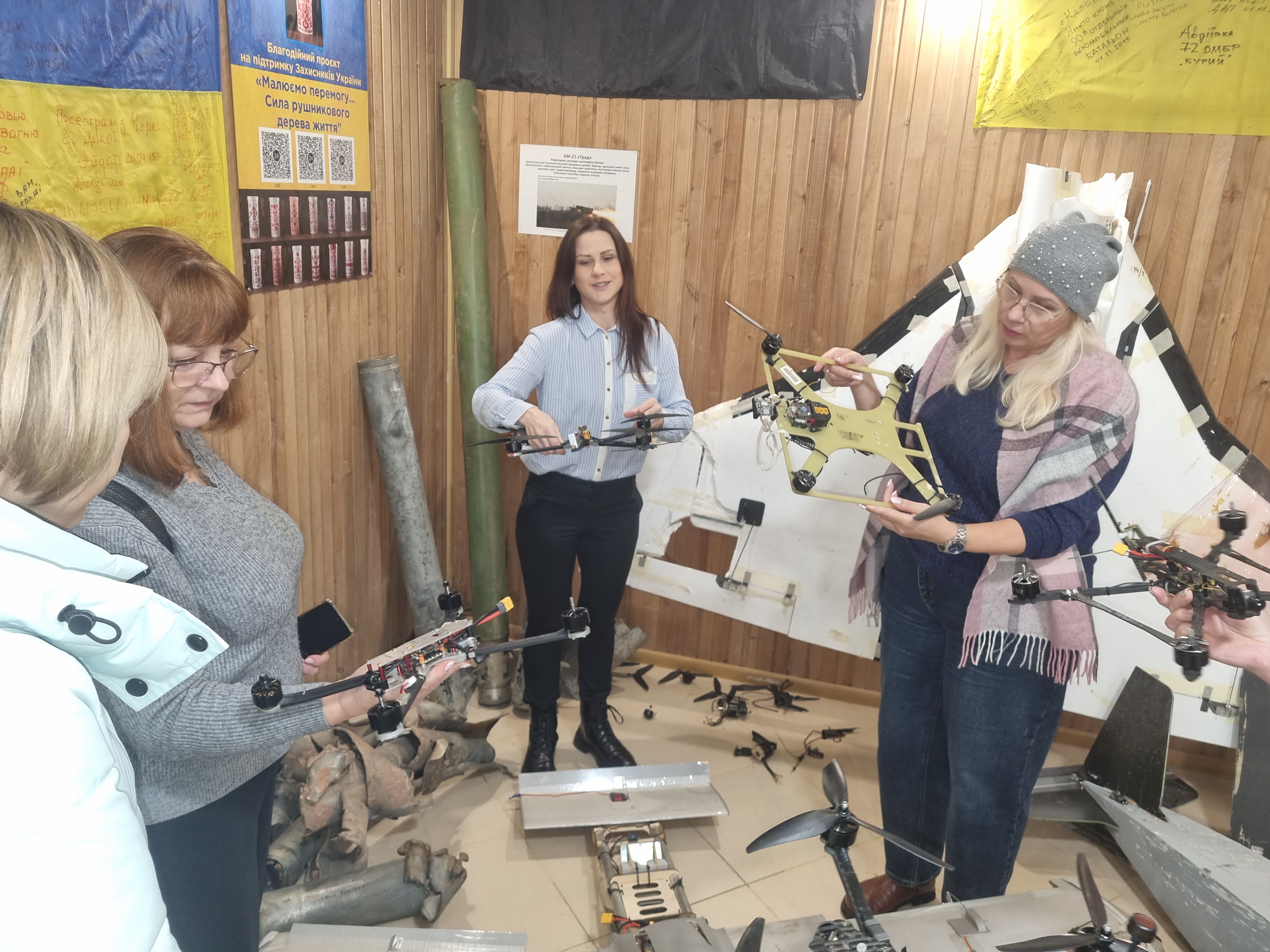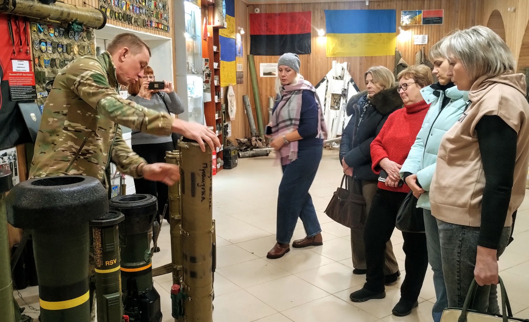Засновник провів екскурсію й ознайомив із більш ніж 10 тисячами експонатів із зони бойових дій та особистими речами легендарних захисників та захисниць, до яких мають можливість доторкнутися всі охочі. Оглянули ПТРК та прапор з підписом легендарного Дмитра Коцюбайла-друга «Да Вінчі», бойові трофеї від бригади «Привиди Києва», українські ПТРК «Стугни», тубуси від протитанкових керуючих реактивних снарядів Javelin, NLAW, якими було знищено ворожу техніку, елементи гільз і снарядів, тубуси від різноманітних ручних гранатометів, різні міни, які використовуються на війні, та сучасні дрони-розвідники.
