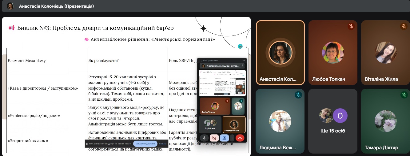 Анастасія Коломієць , консультанка Центру ,розповіла про нові реалії виховної роботи 2026 року. Продемонструвала «10 рішень, які працюють у школах сьогодні», провела майстерку «Антишаблонний редизайн». Присутні виконали вправу «Виклик-рішення».