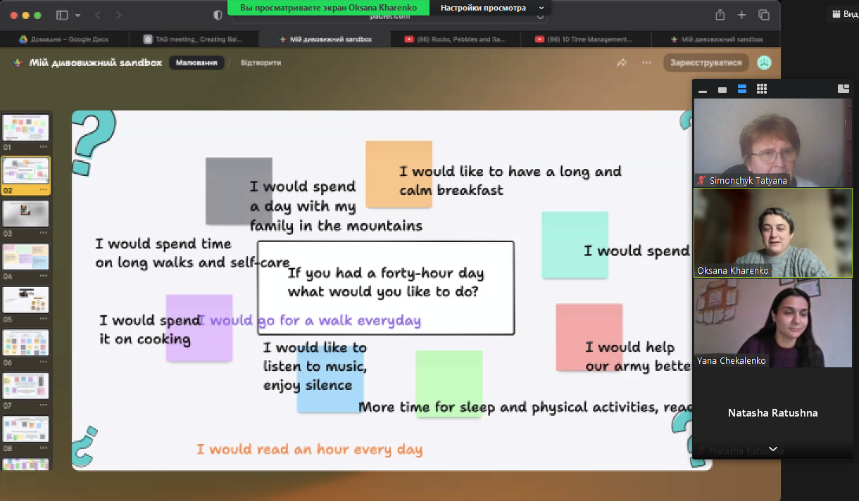 Дякуємо Оксані Харенко, сертифікованому вчителю-фасілітатору проекту МОНУ та Британської ради SWITLO, вчителю вищої кваліфікаційної категорії, вчителю-методисту Леськівського ліцею Леськівської сільської ради, за професіоналізм, глибоке розуміння теми та уміння подати матеріал доступно, практичні поради, які допоможуть подивитися інакше на власний робочий процес та знаходити більше балансу у щоденних рутинах.