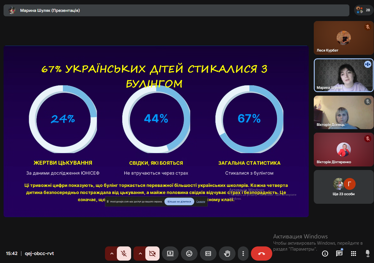 Марина Шуляк, практичний психолог Кумейківської гімназії, поділилася досвідом роботи з питань профілактики булінгу в закладах освіти, познайомила з формами та методами, які використовує у своїй діяльності з питань профілактики цього негативного явища та презентувала сервіси, які використовує у своїй роботі.
