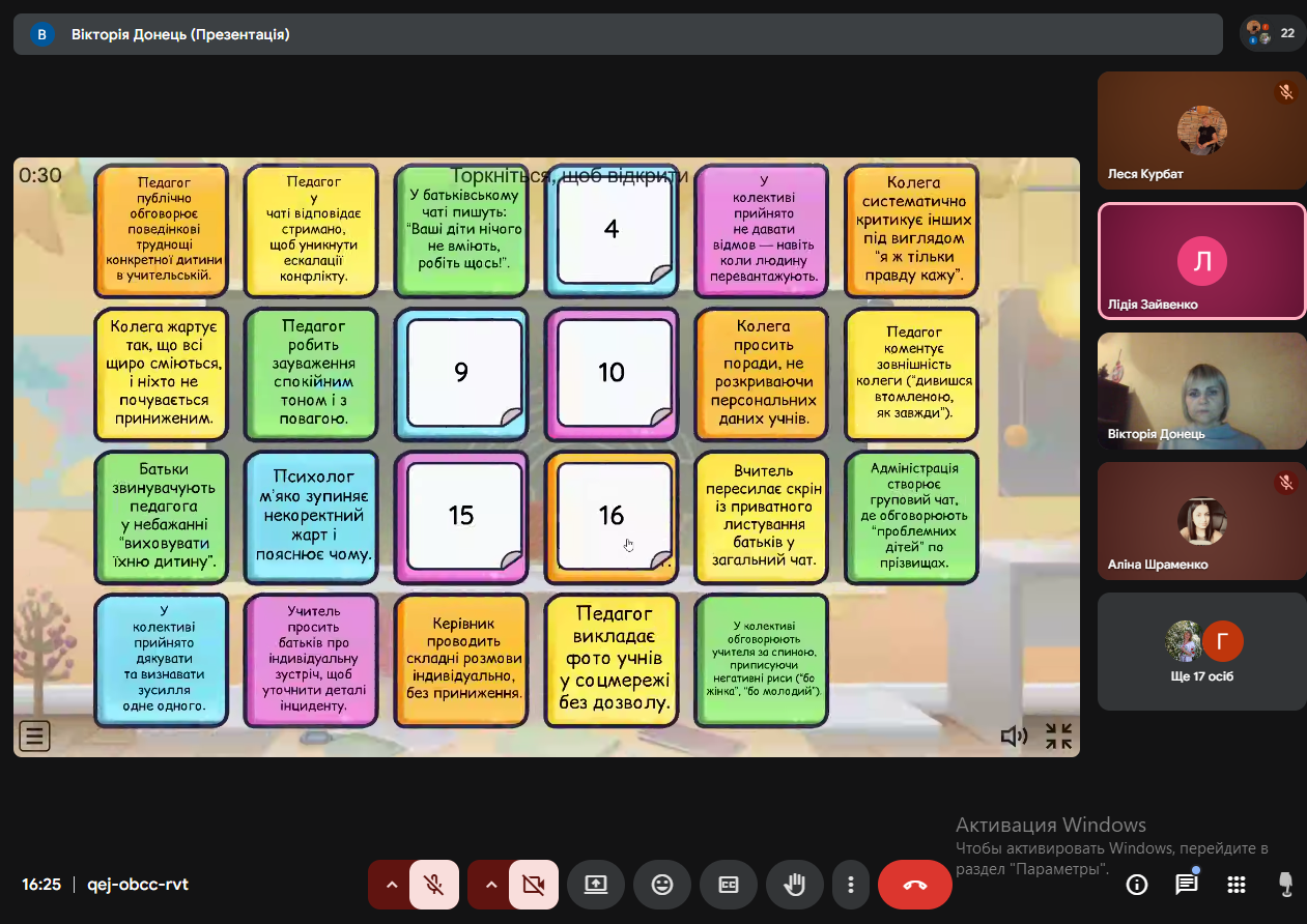 Наприкінці заходу присутні за допомогою гри «Норм чи стрьом» на сервісі wordwall визначили ситуації, які вважаються булінгом чи жорстоким поводженням, а які ні.