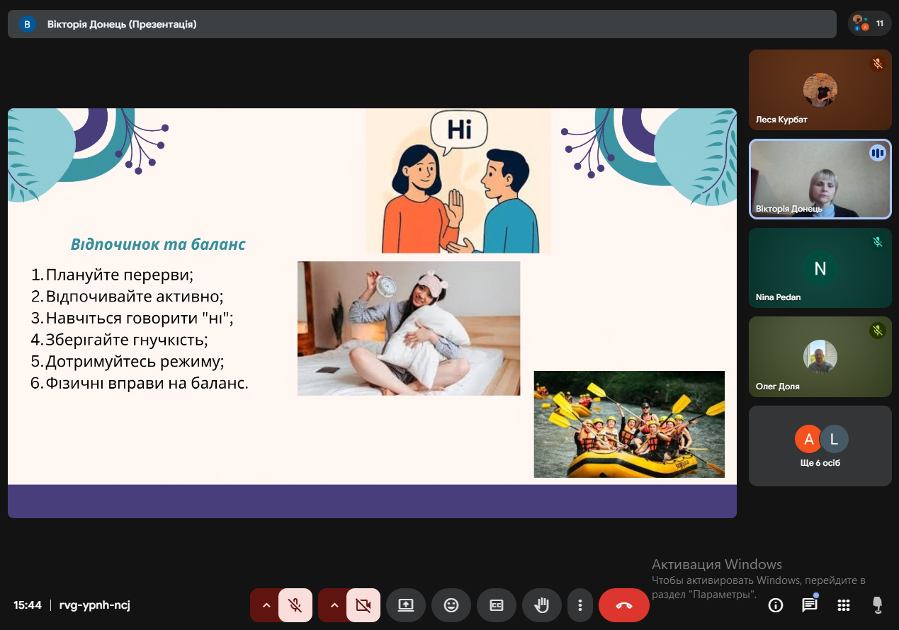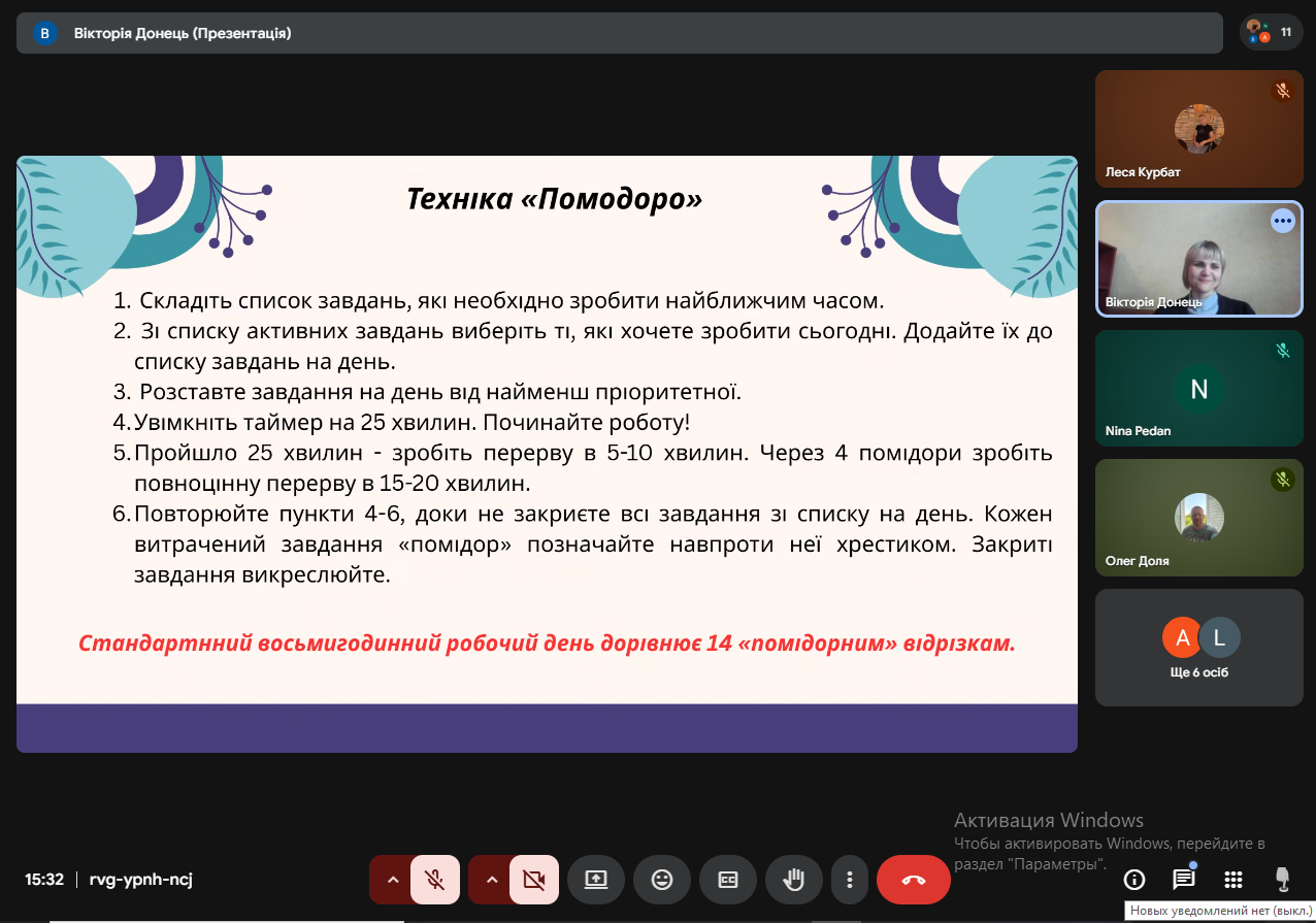 Вікторія Донець, психолог Центру, ознайомила присутніх із поняттям «емоційного» та «професійного» вигорання й за допомогою експрес-діагностик педагоги оцінили свій емоційний стан. Ознайомилися також із технікою «Помодоро», яка допомагає підвищити продуктивність і покращити фокусування, розбиваючи роботу на 25-хвилинні інтенсивні сесії з короткими перервами.