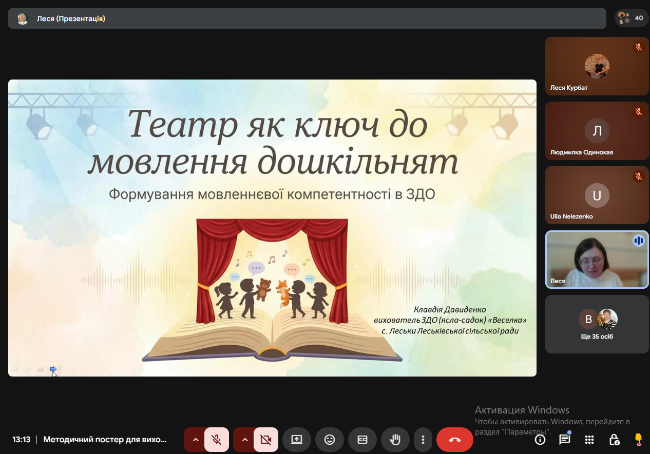 19.12.2025 відбувся методичний постер «Формування мовленнєвої компетентності через театральні методики» для вихователів закладів дошкільної освіти, під час якого Леся Курбат, консультант Центру, акцентувала увагу присутніх на ключових векторах застосування театральних ...