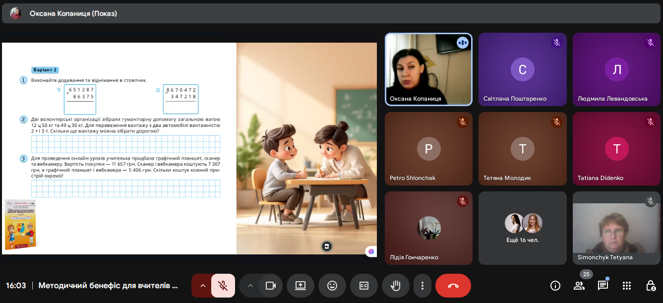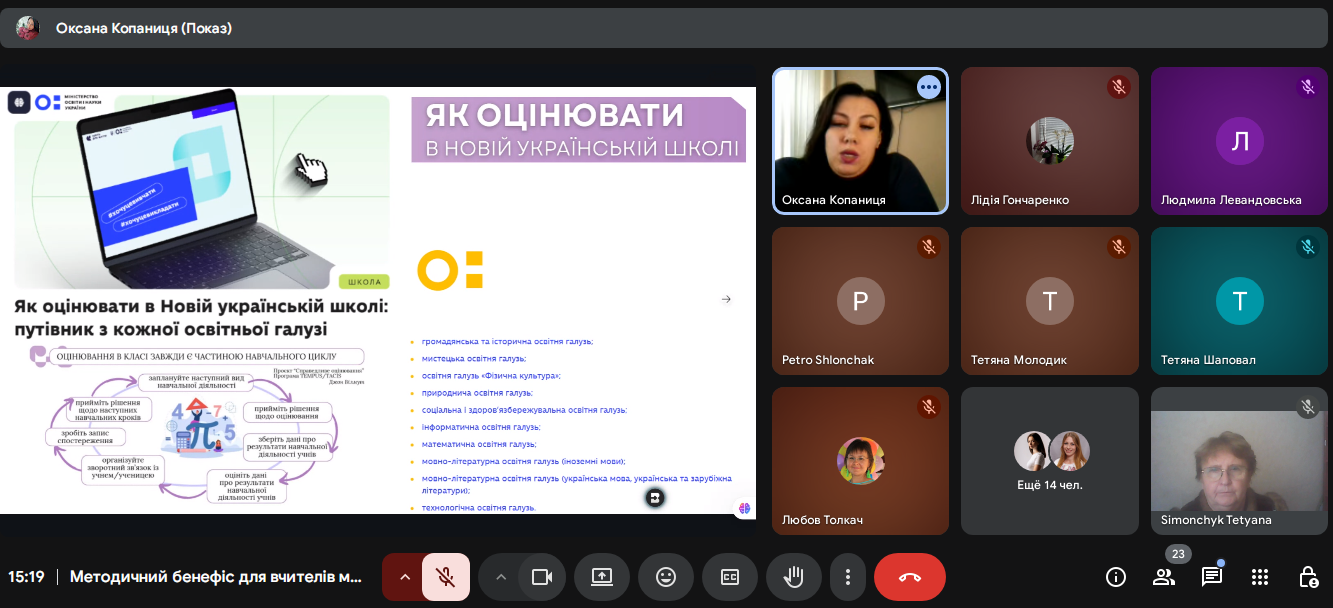Своїм досвідом роботи поділилася Оксана Вікторівна Копаниця, практикуючий вчитель вищої кваліфікаційної категорії Криворізької гімназії №91, тренер з питань сертифікації, методистка з математики бренду «Формула» видавництва відділу методичної підтримки НУШ ТОВ «Видавництво «Лінгвіст». Педагоги обговорили застосування нормативних документів щодо оцінювання, порівняли групи результатів НУШ з галузевими критеріями Державного стандарту, критеріями оцінювання, ознайомилися з путівник «Як оцінювати в НУШ». Спікерка продемонструвала зразки самостійних та комплексних робіт по групам результатів, розповіла про особливості ведення електронного журналу та презентувала власні записи у журналі.