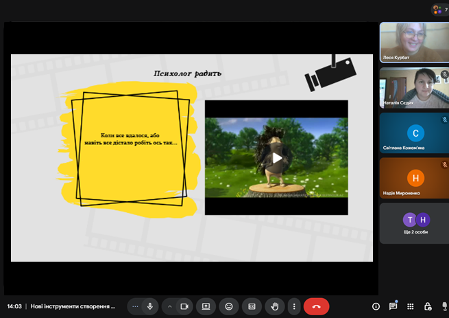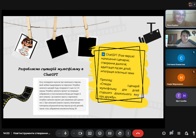 Учасники заходу ознайомилися з алгоритмом створення короткометражного мультфільму, сучасними цифровими інструментами на основі штучного інтелекту, які дозволяють швидко й ефективно створювати анімаційний контент: генерацію персонажів, сюжетів і озвучення. Використання таких інструментів дозволяє значно економити час на підготовку до занять та робити освітній процес максимально захопливим.