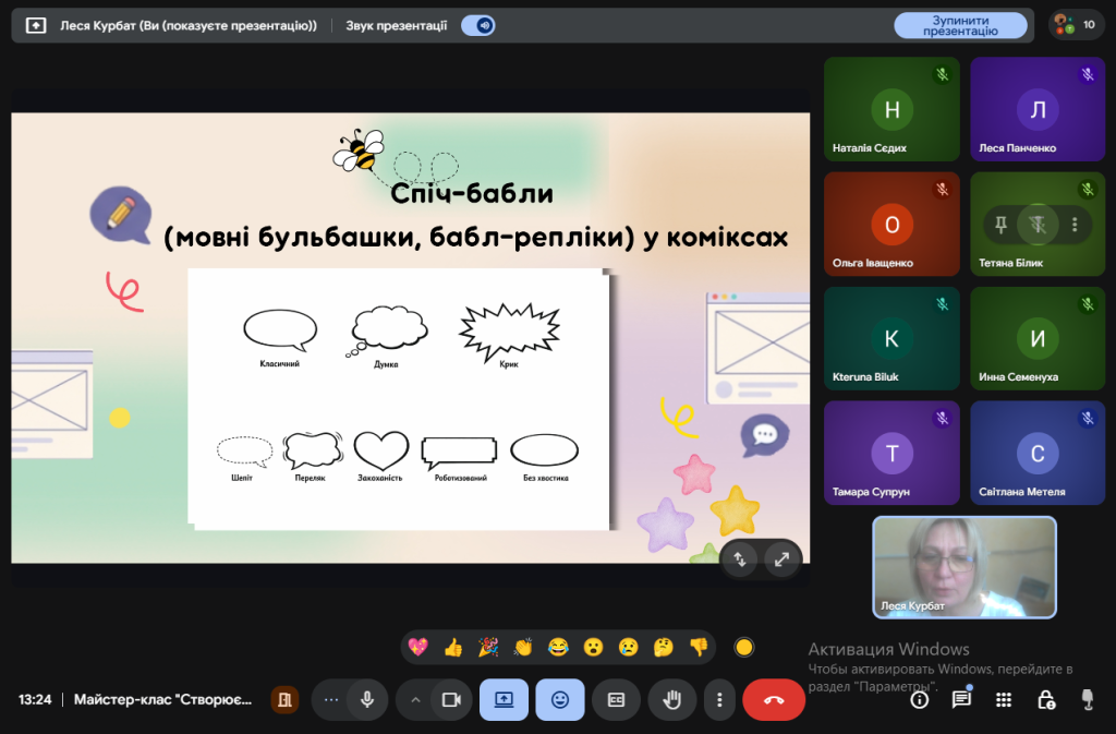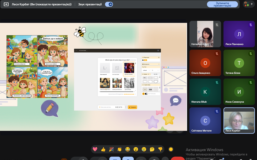 Під час зустрічі учасники дізналися про освітній потенціал коміксів, їхню структуру та можливості використання для розвитку мовлення, уяви й емоційного інтелекту дітей. Особливу увагу було приділено огляду інтерактивних платформ для створення коміксів.