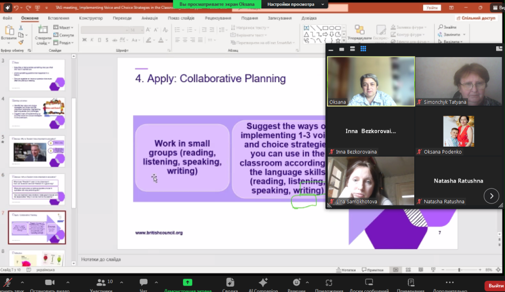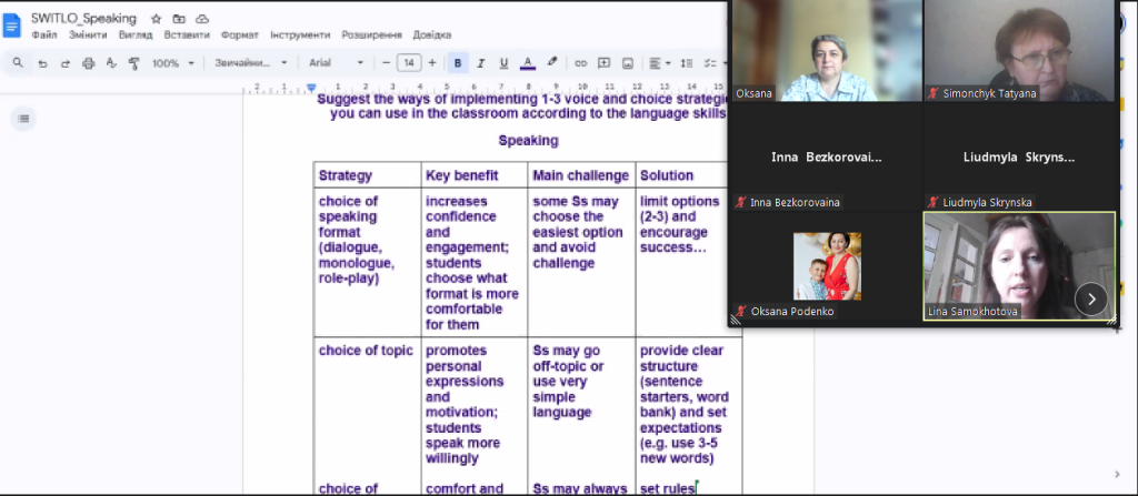 Особливо цінною частиною зустрічі стала спільна робота в групах, під час якої вчителі розробляли практичні способи впровадження стратегій «voice and choice» відповідно до різних мовних навичок: reading, listening, speaking та writing. Учасники не лише генерували ідеї, а й адаптували їх до своїх реальних умов викладання.