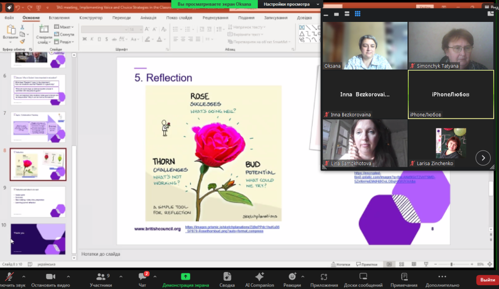Завершилася зустріч рефлексією, під час якої учасники оцінили власний досвід за моделлю «Rose–Thorn–Bud» та визначили конкретні кроки для подальшого впровадження нових підходів у своїй практиці.