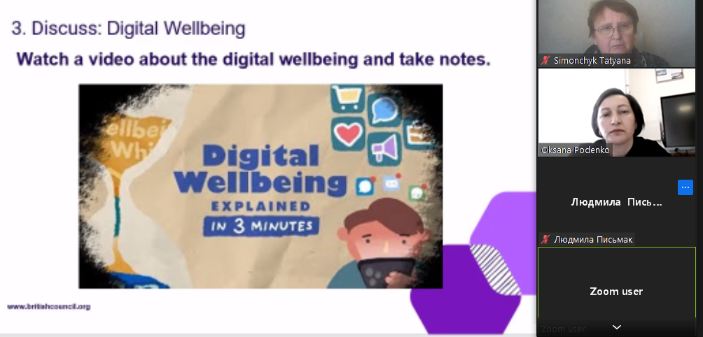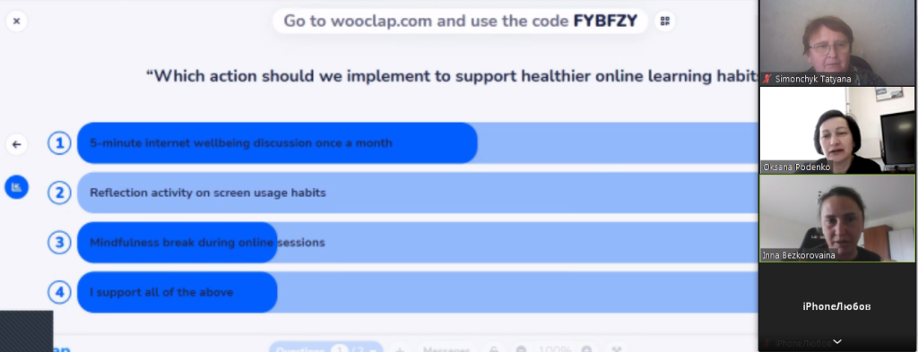 Учасники обговорювали власні цифрові звички, їх плюси й мінуси, проаналізували, як Інтернет впливає на добробут учителів та учнів, поділилися досвідом використання Інтернету в освітньому процесі, переглянули й обговорили відео Digital Wellbeing | Explained in 3 Minutes й розробили практичні стратегії для покращення онлайн-звичок. Оксана Поденко, фасилітатор, провела інтерактивне опитування на платформі Wooclap щодо безпечного використання Інтернету як вчителями й учнями, результати якого викликали жваву дискусію.