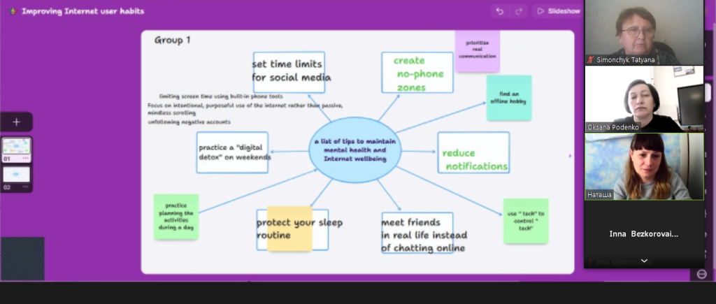 17.04.2026 відбувся дев’ятнадцятий практикум «Internet Usage and Mental Health (Internet Wellbeing» вчителів англійської мови закладів загальної середньої освіти групи TAG-3, які продовжують працювати за проєктом SWITLO.